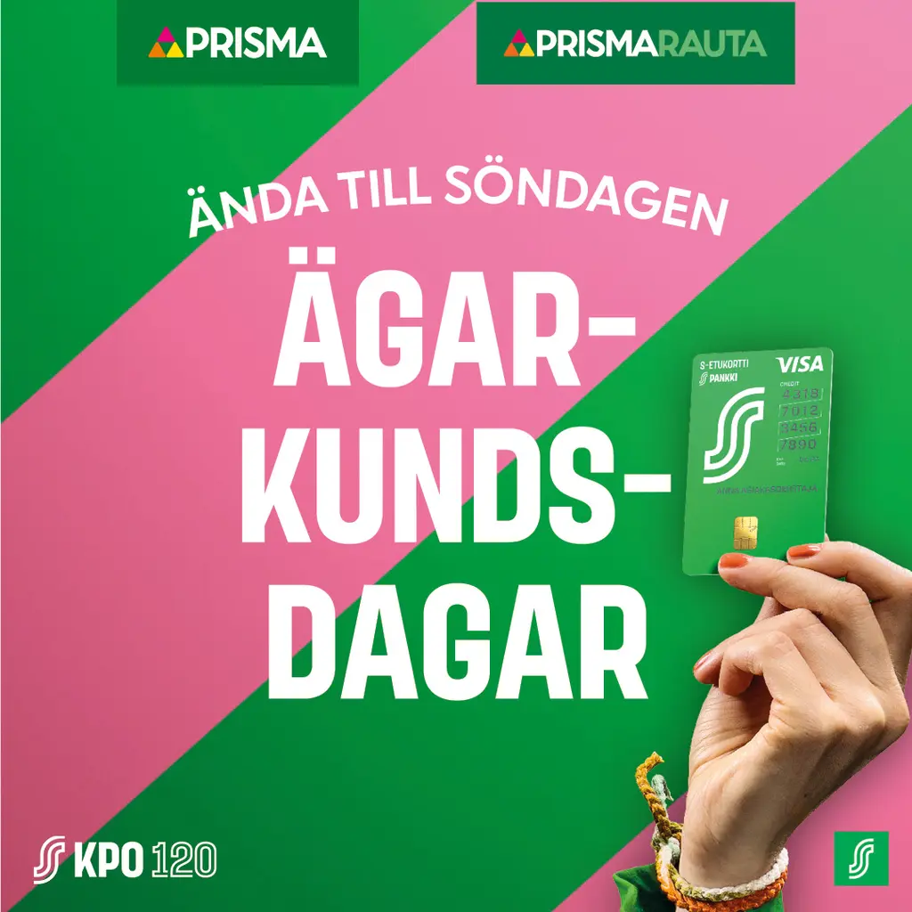 Ägarkundsdagar firas från onsdag till söndag 12–16.11.2025 i KPO:s Prisma-varuhus och Karlebys Prisma Rauta. Med S-Förmånskortet får du även t.o.m. -15% på alla bruksvaror.